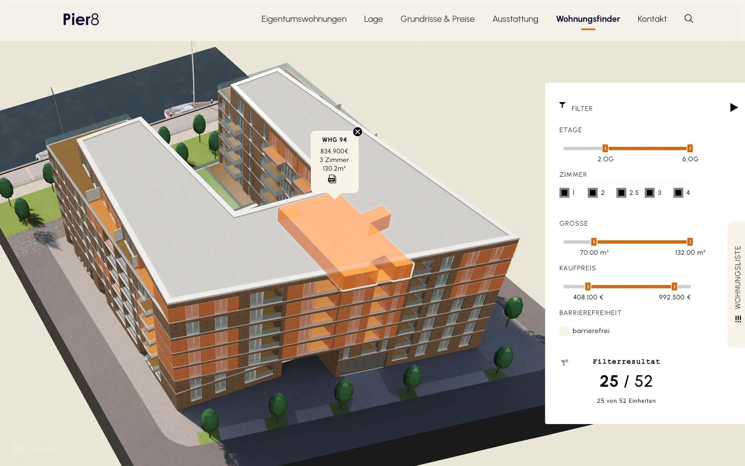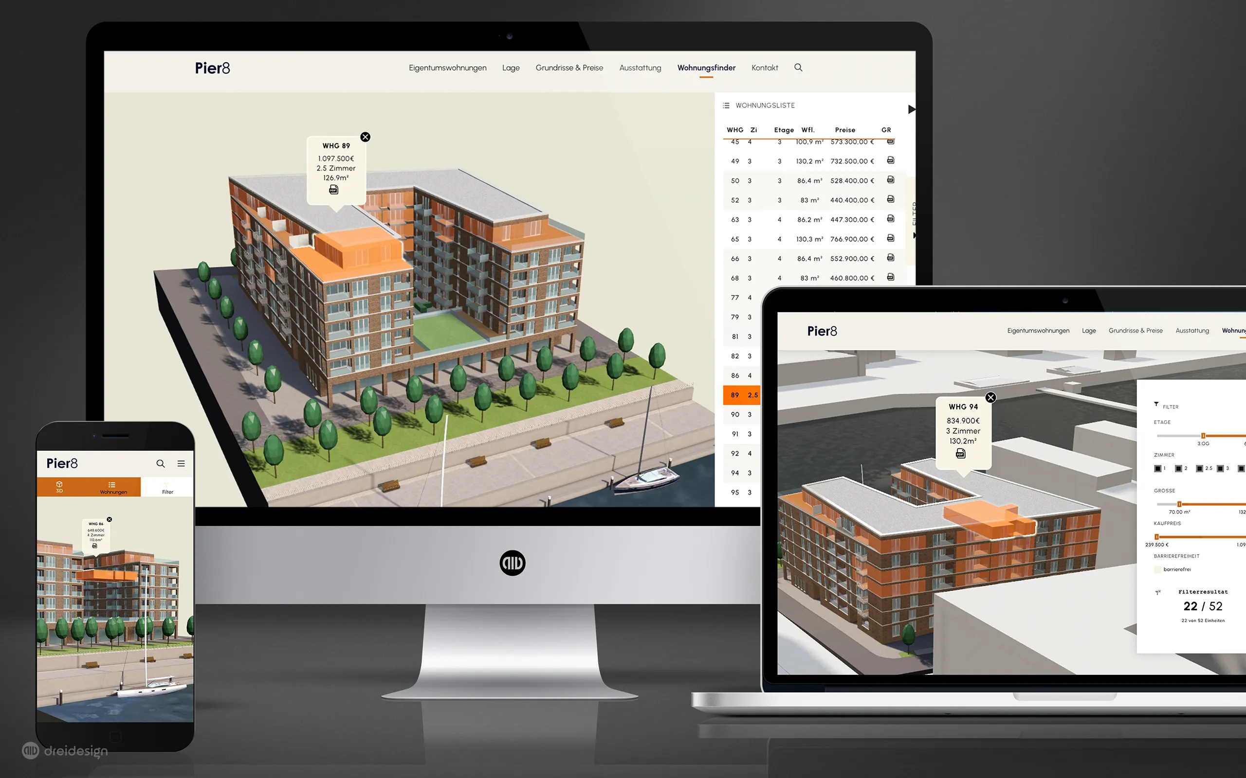 Für die Vermarktung durfte dreidesign einige Innenraumvisualisierungen und unseren Wohnungsfinder erstellen.